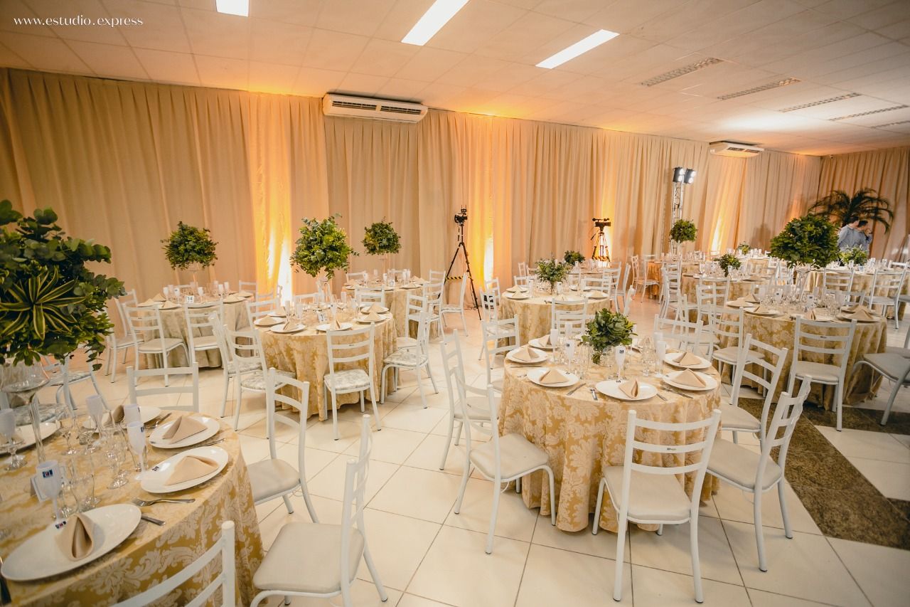Possuímos salão de eventos para aproximadamente 600 pessoas, equipado com cadeiras e mesas redondas, banheiros amplos e compatíveis com grandes eventos, cozinha com churrasqueira, bancadas revestidas em mármore, pia com 03 cubas, fogão industrial, geladeira, ambiente climatizado contando no total de seis ar condicionados e estacionamento, além de um amplo hall de entrada com acesso a todas as salas.
